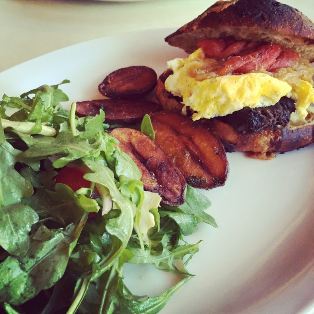 De tous les plats qui me font de l’oeil, c’est la tartine de boudin noir qui attirera mon attention. OMG, un vrai délice! Galette de boudin, oeuf, tomates confites, oignons caramélisés le tout sur une tranche de pain chedder et figues de la Boulangerie Guillaume. C’était, croustillant et savoureux, bref j’ai adoré.